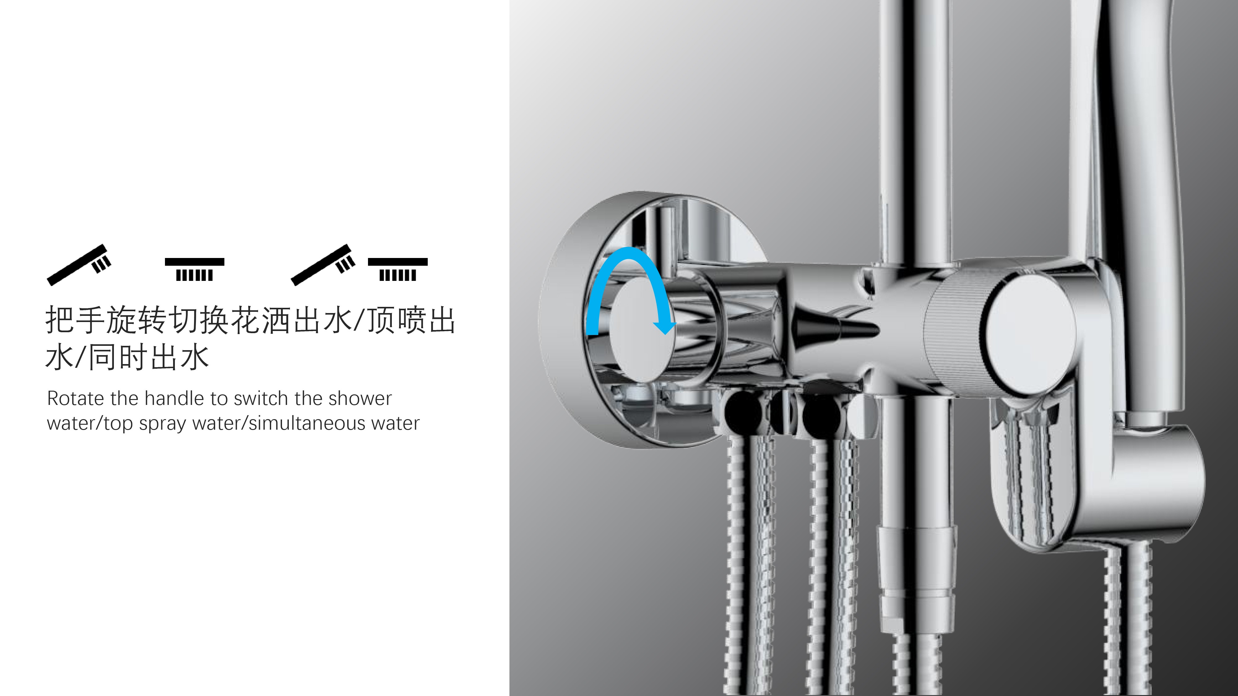 八功能寬大頂噴;Z字形三通;按壓切換頂噴/花灑出水
