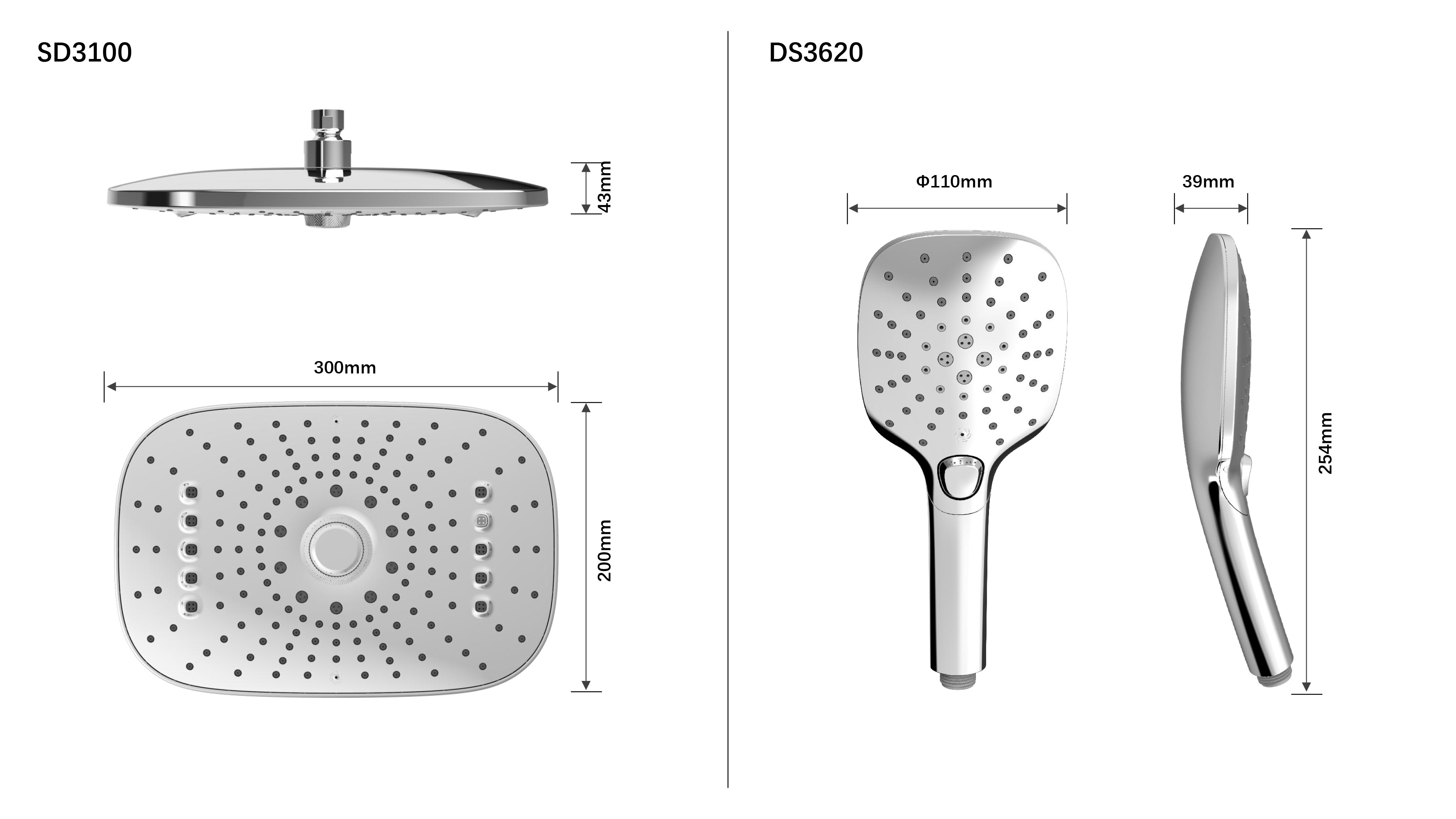 方形寬大頂噴富氧出水;Z字形三通;按壓切換花灑出水/頂噴出水